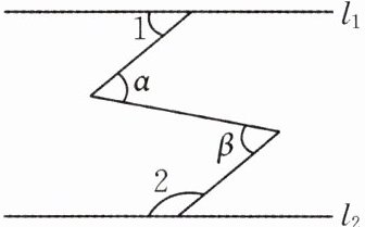 5. 如图,若直线l₁//l₂,∠α = ∠β,∠1 = 40°,则∠2的度数为______。