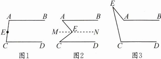 (3)类比探究:若将橡皮筋拉成如图3的形状,类比(2)中的方法探究∠AEC,∠EAB与∠ECD之间有何关系?并说明理由。