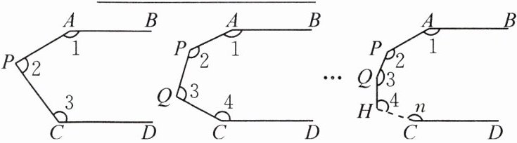 4. 如图,已知AB//CD,易得∠1 + ∠2 + ∠3 = 360°,∠1 + ∠2 + ∠3 + ∠4 = ________,……根据以上的规律得∠1 + ∠2 + ∠3 + … + ∠n = ______________。