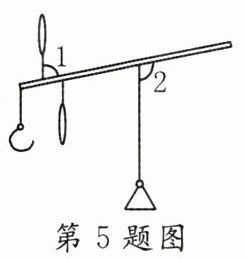 5. (娄底中考)一杆古秤在称物时的状态如图所示,已知$\angle 1 = 80^{\circ}$,则$\angle 2=$( )
