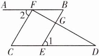 (1)得,$\angle CFD = 90^{\circ}$,所以$\angle C + \angle D = 90^{\circ}$。因为$\angle 2$和$\angle D$互余,所以$\angle 2 + \angle D = 90^{\circ}$。所以$\angle C = \angle 2$。所以$AB// CD$。