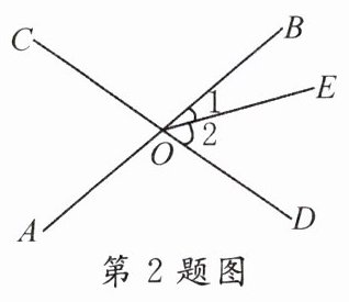 2. (苏州中考)如图,直线$AB$与$CD$相交于点$O$,$\angle AOC = 75^{\circ}$,$\angle 1 = 25^{\circ}$,则$\angle 2$的度数是( )