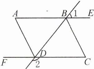 (1)因为$\angle 2 + \angle BDC = 180^{\circ}$,$\angle 1 + \angle 2 = 180^{\circ}$,所以$\angle 1 = \angle BDC$。所以$AB// CF$。所以$\angle C = \angle EBC$。又因为$\angle A = \angle C$,所以$\angle A = \angle EBC$。所以$AD// BC$。
