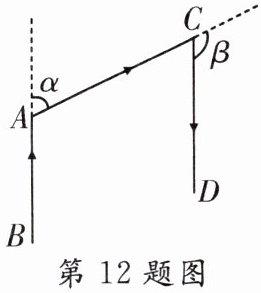 12. 如图,一辆汽车经过两次转弯后,行驶的方向与原来保持平行,如果第一次转过的角α为64°,则第二次转过的角β为______°。