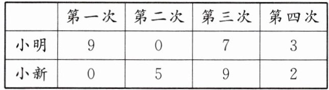 12. 在七年级数学“感受可能性”一节课中,小明和小新分别转动标有“0~9”十个数字的转盘四次,每次将转出的数填入表示四位数的四个方格中的任意一个,比较两人得到的四位数,谁大谁获胜。已知他们四次转出的数字如下表:
