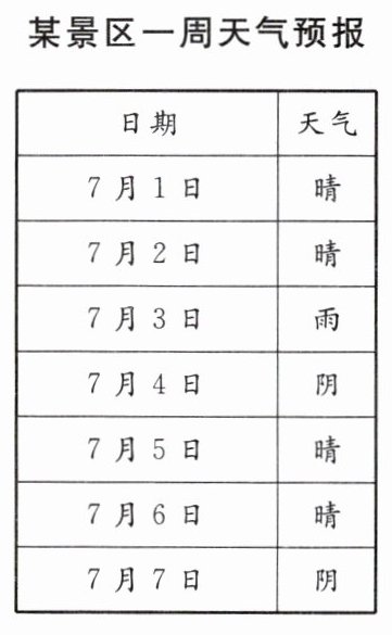 7. 某景区7月1日~7日一周的天气预报如下,小丽打算选择这期间的一天或两天去该景区旅游,求下列事件的概率: