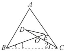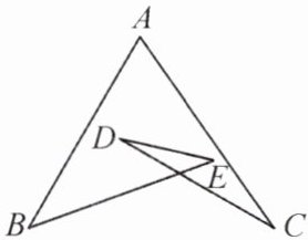 解:如图,连接$BC$,设$BE$和$DC$的交点为$O$,因为$\angle A = 65^{\circ},\angle ABE = 40^{\circ},\angle ACD = 25^{\circ}$,所以$\angle 1+\angle 2 = 180^{\circ}-\angle A-\angle ABE-\angle ACD = 180^{\circ}-65^{\circ}-40^{\circ}-25^{\circ}=50^{\circ}$。因为$\angle D+\angle E+\angle DOC=\angle 1+\angle 2+\angle BOC = 180^{\circ},\angle DOE=\angle BOC$,所以$\angle D+\angle E=\angle 1+\angle 2$,所以$\angle D+\angle E = 50^{\circ}$。