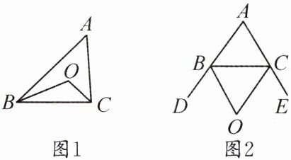 (2)如图2所示,∠CBD,∠BCE的平分线交于点O,写出∠BOC与∠A的关系,并说明理由。