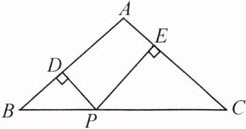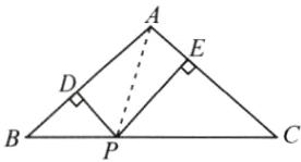 14. 如图所示,在△ABC中,AB = AC = 8,P是BC上任意一点,PD⊥AB于点D,PE⊥AC于点E。若△ABC的面积为14,问:PD + PE的值是否确定?若能确定,求出该值;若不能确定,请说明理由。