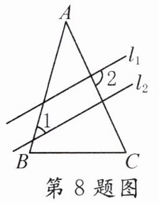 8. 如图,直线l₁//l₂,且分别与△ABC的两边AB,AC相交,若∠A = 40°,∠1 = 45°,则∠2的度数为______。