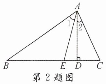 2. 如图,在△ABC中,AD⊥BC,AE平分∠BAC,若∠1 = 40°,∠2 = 25°,则∠B的度数为 ( )