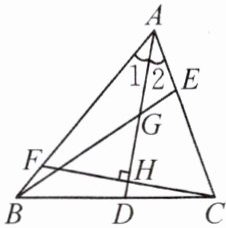 6. 如图,在$\triangle ABC$中,$\angle 1=\angle 2$,$G$为$AD$的中点,延长$BG$交$AC$于点$E$,$F$为$AB$上一点,且$CF\perp AD$于点$H$,下列判断中正确的个数是( )