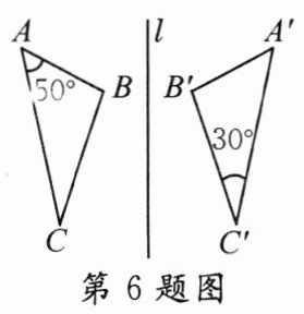 6. 如图,△ABC和△A'B'C'关于直线l对称,若∠A = 50°,∠C' = 30°,则∠B的度数为( )