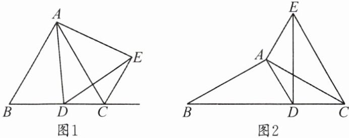 16. 如图,在△ABC中,AB = AC,D为线段BC上一动点(不与点B,C重合),连接AD,作∠DAE = ∠BAC,且AD = AE,连接CE。