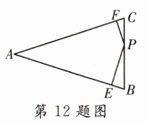 12. (娄底中考)如图,在△ABC中,AB = AC = 2,P是BC上任意一点,PE⊥AB于点E,PF⊥AC于点F,若S△ABC = 1,则PE + PF = ______。