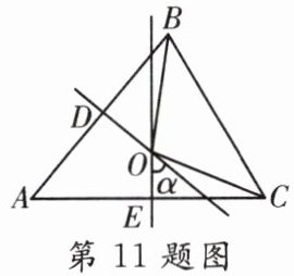 11. 如图,在$\triangle ABC$中,点$O$是边$AB$和$AC$的垂直平分线$OD$,$OE$的交点,若$\angle BOC = 100^{\circ}$,则这两条垂直平分线相交所成锐角$\alpha$的度数为( )