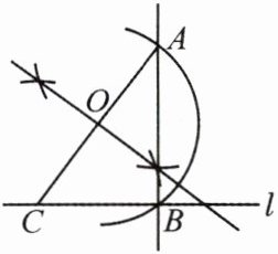 解:如图,连接OB,由题意知OB=OA=OC,所以∠OAB=∠OBA,∠OCB=∠OBC。所以∠OCB+∠CAB=∠ABC。因为∠ABC+∠OAB+∠OCB=180°,所以2∠ABC=180°。所以∠ABC=90°,即AB⊥l。