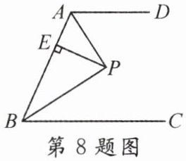 8. 如图,AD//BC,∠ABC的平分线BP与∠BAD的平分线AP相交于点P,作PE⊥AB于点E,若PE = 3,则点P到AD与BC的距离之和为( )