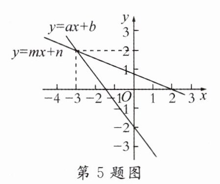 5. (贵阳中考)在同一平面直角坐标系中,一次函数 y = ax + b 与 y = mx + n(a<m<0)的图象如图所示。小星根据图象得到如下结论:
