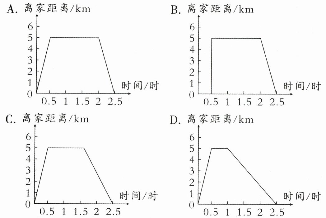 9. 李芳和妈妈周日早上从家出发,乘车0.5小时,到达离家5km远的科技馆,在参观1.5小时后,乘车0.5小时返回家中。下面四幅图中,能够描述她们这一活动行程的是( )。