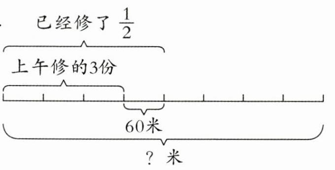 3. 某工程队修一段路,上午已修的与剩下未修的长度比是3:5,下午又修了60米,这时已修的占这段路总长度的$\frac{1}{2}$。这段路原来长多少米?(先把线段图补充完整,再解答)(6分)