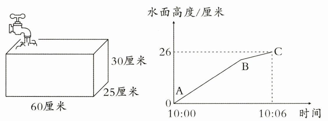 3. 如图,一个无水的长方体玻璃缸,长60厘米、宽25厘米、高30厘米。一个水龙头从10:00开始向这个玻璃缸内注水,水的流量为6立方分米/分,10:05关闭水龙头停止注水。接着在玻璃缸内放入一个高20厘米的圆柱铁块,全部浸没于水中。玻璃缸的水面高度从注水到放入铁块的变化情况如图所示。(6分)