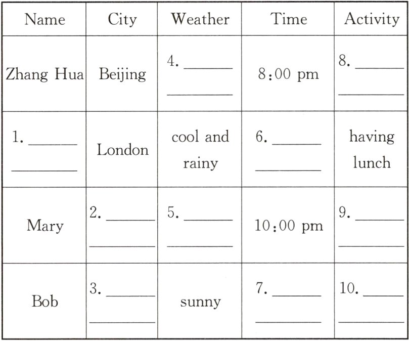 你了解地球上不同地区的时差吗? 同一时刻,不同国家的四位小朋友分别在做什么呢? 阅读短文,完成表格。