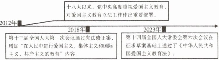 爱国之情,上升为国家意志。同学们收集到爱国主义教育法出台历程中的三个重要举措,绘制了如下进程图。