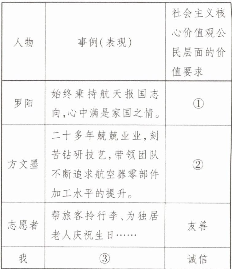 (3)①爱国;②敬业;③比如在考试中不作弊,或者答应别人的事情一定做到。