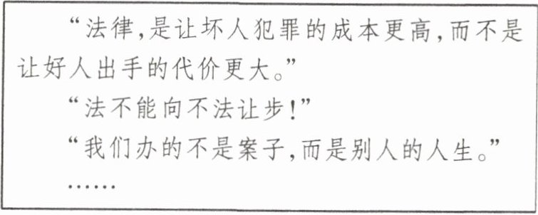 (1)①“法律,是让坏人犯罪的成本更高,而不是让好人出手的代价更大。”这意味着法律的首要目标是对违法犯罪行为进行严厉制裁,增加犯罪分子的违法成本,从而起到预防和遏制犯罪的作用。同时,法律也要保障公民在合法范围内维护自身和他人权益的行为,不能让正义之举受到不公正的对待,否则会削弱公众对法律的信任和对正义的追求。②“法不能向不法让步!”这鲜明地表达了法律的权威性和不可侵犯性。公正司法是维护社会公平正义的最后防线,不能因为不法行为的嚣张或者复杂情况而妥协退缩。我们必须坚决依法办事,维护法律的尊严和公正,让违法者承担应有的责任。③“我们办的不是案子,而是别人的人生。”这句话深刻地揭示了司法工作的深远影响和重大责任。每一个案件背后都关系着当事人的命运、家庭和未来。我们的每一个判断和决定,都可能对他们的生活产生不可逆的改变。因此,在办理案件时,必须怀着敬畏之心,严谨细致,以事实为依据,以法律为准绳,确保司法公正,给当事人一个公正合理的结果。