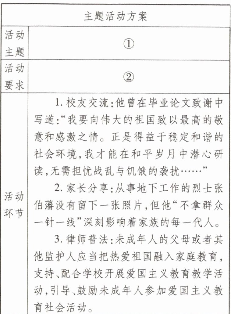 2024年1月1日,《中华人民共和国爱国主义教育法》正式施行。某校师生准备开展主题活动,请你完成方案的部分内容。