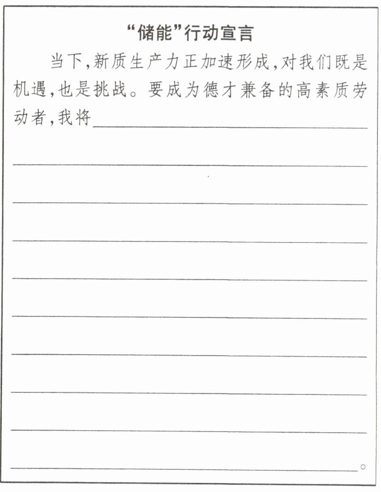 (3)作为新时代的劳动者,我们应为未来“储能”,去适应新质生产力发展的要求。请写下你的“储能”行动宣言。要求:紧扣主题,价值观正确,逻辑合理,表述清晰,不少于60字。