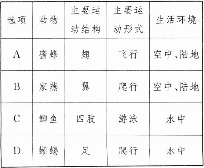 1.(2022·怀化)下列动物与其主要运动方式对应不正确的是 ( )