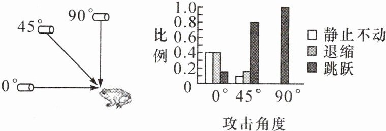 13.[跨科学融合]某研究小组通过模拟捕食者对非洲蟾蜍的攻击行为,以研究非洲蟾蜍的逃避策略。该研究小组分别从0°、45°、90°对蟾蜍抛掷易拉罐,以模拟捕食者从不同方向对其进行攻击,观察并记录蟾蜍的逃避方式及相关比例,如图所示。下列有关叙述错误的是 ( )