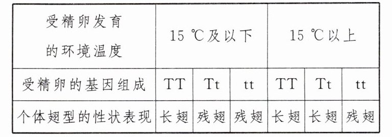 (3)科学实验发现,果蝇的翅型是由个体受精卵中的基因组成和发育过程中环境温度共同作用的结果,具体情况如表: