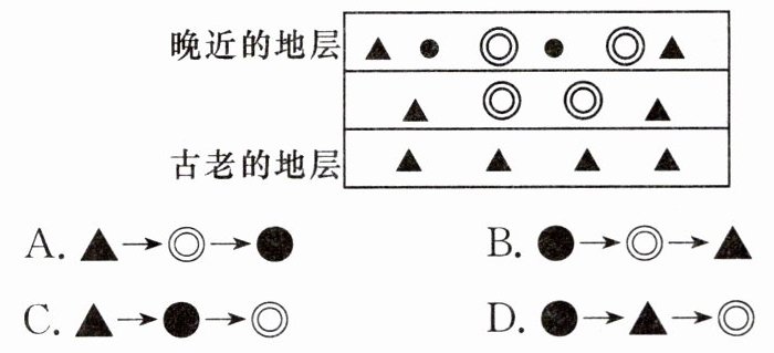 9.【证据推理】化石是研究生物进化最直接最可靠的证据。若▲、〇、●表示具有亲缘关系的三类生物,如图表示这三类生物的化石在未经变动的不同地层中的出现情况,则三类生物的进化关系最可能的是( )