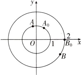 例4 如图,点$A,B$分别是圆心在坐标原点,半径为1和2的圆上的动点.动点$A$从初始位置$A_0(\cos\frac{\pi}{3},\sin\frac{\pi}{3})$开始,按逆时针方向以角速度2 rad/s做圆周运动,同时点$B$从初始位置$B_0(2,0)$开始,按顺时针方向以角速度2 rad/s做圆周运动.记$t$时刻,点$A,B$的纵坐标分别为$y_1,y_2$.