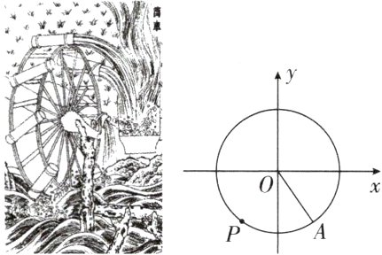 4.(多选)(2024·西南大学附中模拟)水车在古代是进行灌溉引水的工具,亦称“水转筒车”,是一种以水流作动力,取水灌田的工具.据史料记载,水车发明于隋而盛于唐,距今已有1000多年的历史,是人类的一项古老的发明,也是人类利用自然和改造自然的象征,如图是一个半径为$R$的水车,一个水斗从点$A(3,-3\sqrt{3})$出发,沿圆周按逆时针方向匀速旋转,且旋转一周用时120秒.经过$t$秒后,水斗旋转到点$P$,设点$P$的坐标为$(x,y)$,其纵坐标满足$y = f(t)=R\sin(\omega t+\varphi)(t\geqslant0,\omega>0,|\varphi|<\frac{\pi}{2})$,则下列叙述正确的是( )