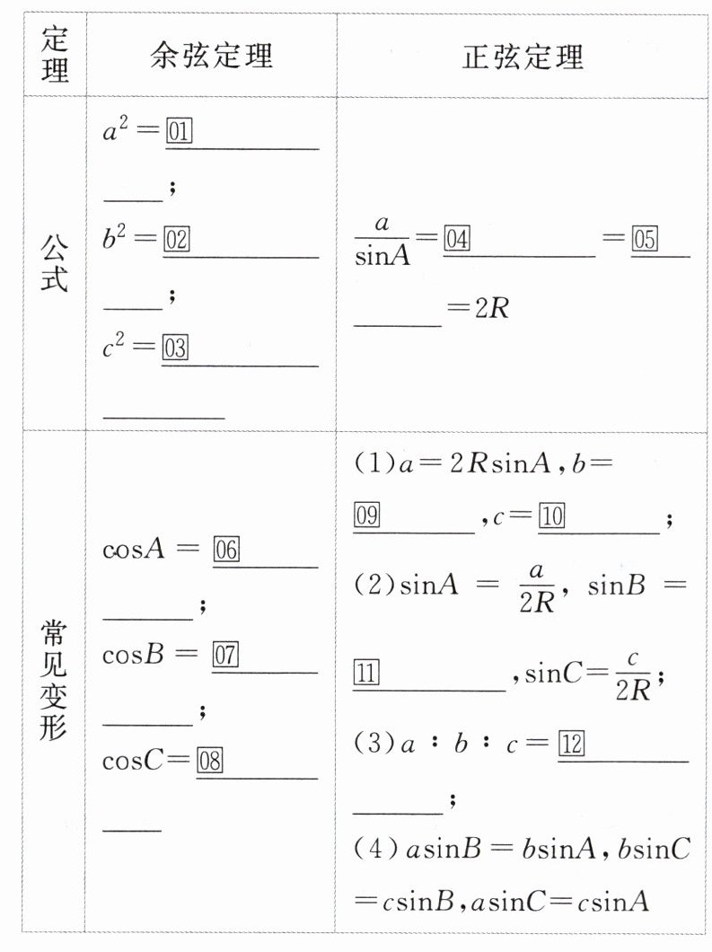 ①$b^{2}+c^{2}-2bc\cos A$ ②$c^{2}+a^{2}-2ca\cos B$ ③$a^{2}+b^{2}-2ab\cos C$ ④$\frac{b}{\sin B}$ ⑤$\frac{c}{\sin C}$ ⑥$\frac{b^{2}+c^{2}-a^{2}}{2bc}$ ⑦$\frac{c^{2}+a^{2}-b^{2}}{2ac}$ ⑧$\frac{a^{2}+b^{2}-c^{2}}{2ab}$ ⑨$2R\sin B$ ⑩$2R\sin C$ ⑪$\frac{b}{2R}$ ⑫$\sin A:\sin B:\sin C$