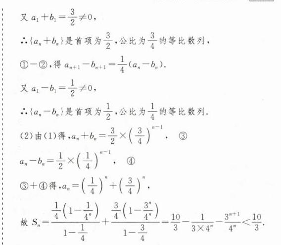 (1)证明:数列$\{ a_{n}+b_{n}\}$,$\{ a_{n}-b_{n}\}$为等比数列;