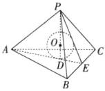 解析 如图,过点P作PD⊥平面ABC于点D,连接AD并延长交BC于点E,连接PE。因为△ABC是正三角形,所以AE是BC边上的高和中线,D为△ABC的中心。因为AB = BC = 2√3,所以S△ABC = 3√3,DE = 1,PE = √2。所以S三棱锥表 = 3×$\frac{1}{2}$×2√3×√2+3√3 = 3√6+3√3。因为PD = 1,所以三棱锥的体积V=$\frac{1}{3}$×3√3×1 = √3。设内切球的半径为r,以球心O为顶点,三棱锥的四个面为底面,把正三棱锥分割为四个小三棱锥,由$\frac{1}{3}$S三棱锥表·r = √3,得r=$\frac{3\sqrt{3}}{3\sqrt{6}+3\sqrt{3}}$=√2 - 1。