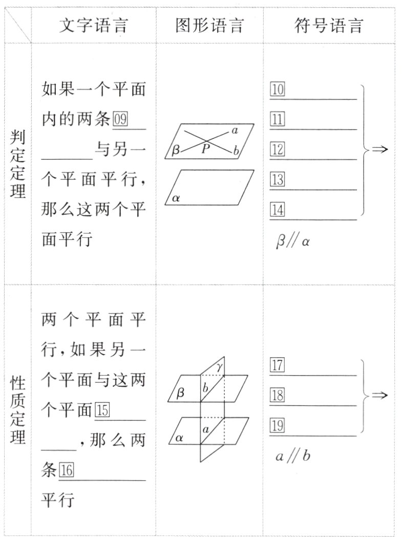 09.相交直线 10.$a\subset\beta$ 11.$b\subset\beta$ 12.$a\cap b = P$