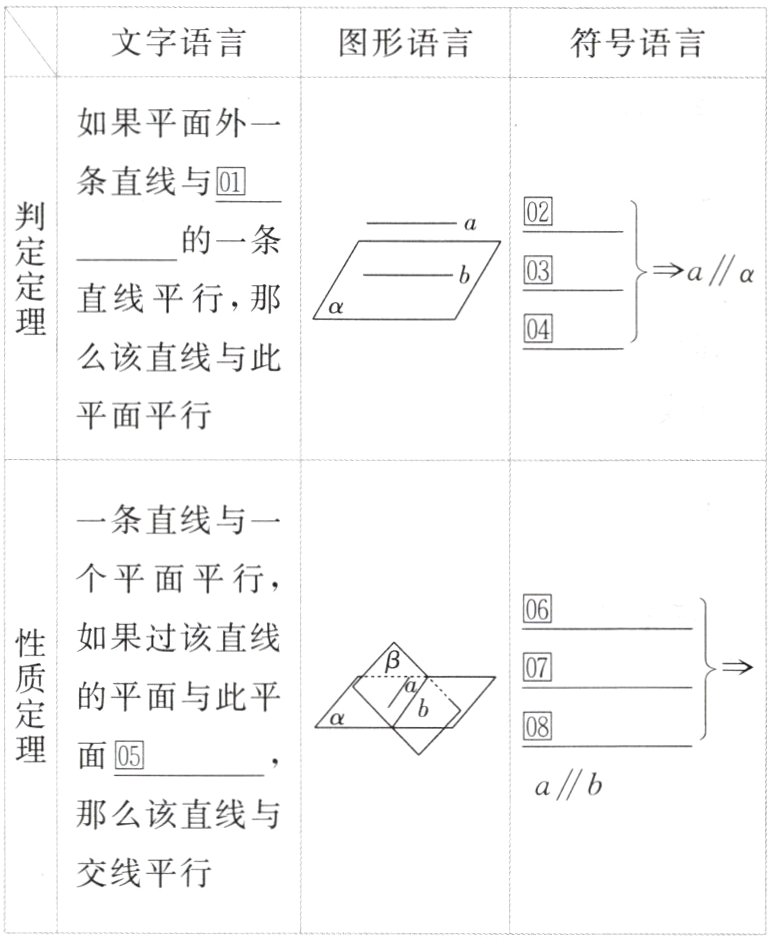 01.此平面内 02.$a\not\subset\alpha$ 03.$b\subset\alpha$ 04.$a// b$ 05.相交 06.$a//\alpha$