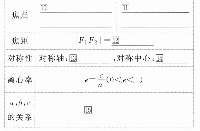 04$-a\leqslant x\leqslant a$且$-b\leqslant y\leqslant b$ 05$-b\leqslant x\leqslant b$且$-a\leqslant y\leqslant a$ 06$A_1(-a,0),A_2(a,0),B_1(0,-b),B_2(0,b)$ 07$A_1(0,-a),A_2(0,a),B_1(-b,0),B_2(b,0)$ 08$2b$ 09$2a$ 10$F_1(-c,0),F_2(c,0)$ 11$F_1(0,-c),F_2(0,c)$ 12$2c$ 13$x$轴和$y$轴 14原点 15$a^{2}=b^{2}+c^{2}$