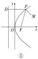 解析 当点M(20,40)位于抛物线内时,如图①,过点P作抛物线准线的垂线,垂足为D,则|PF| = |PD|,|PM| + |PF| = |PM| + |PD|.当M,P,D三点共线时,|PM| + |PF|的值最小.由最小值为41,得$20+\frac{p}{2}=41$,解得p = 42;当点M(20,40)位于抛物线外时,如图②,当F,P,M三点共线时,|PM| + |PF|的值最小.由最小值为41,得$\sqrt{40^2+(20-\frac{p}{2})^2}=41$,解得p = 22或p = 58.当p = 58时,$y^2 = 116x$,点M(20,40)在抛物线内,故舍去.综上,p = 42或p = 22.