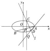 (2)直线l与椭圆M交于C,D两个不同的点(异于A,B),过C作x轴的垂线分别交直线AB,AD于点P,Q,当P是CQ的中点时,证明:直线l过定点.