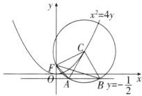 (1)知 $F(0,1)$,准线方程为 $y=-1$,设 $\angle AFB=\theta$,圆 $C$ 的半径为 $r$,则 $\angle ACB = 2\theta$,$|FC|=|CA|=|CB|=r$,