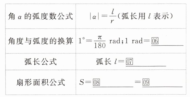 6.$(\frac{180}{\pi})^{\circ}$ 7.$|\alpha|r$ 8.$\frac{1}{2}lr$ 9.$\frac{1}{2}|\alpha|r^{2}$