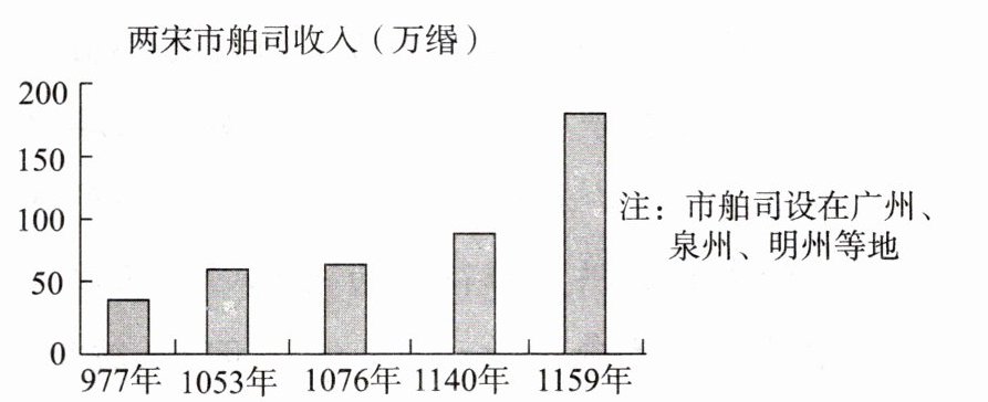 材料三 根据考古发掘,东起日本,南到印度尼西亚,西到东非,甚至在非洲内陆的津巴布韦都有宋代瓷器的迹象。据记载,与宋代进行通商的国家和地区有50个,其中宋代海船直接到达的有20多个。……北宋初年,广州的市舶收入只是占了国家财政收入的2%,到了南宋初年这个比例更高些。