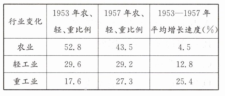 材料二 1953—1957年我国农业、轻工业和重工业产值增长速度和比重变化表